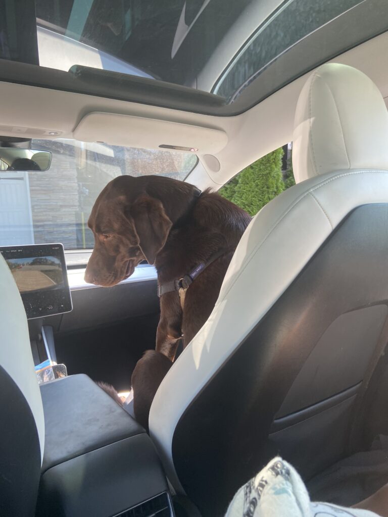 “Hi I’m Madden the chocolate Labrador Retriever. I get lonely in the back seat so I sneak in the front so I can be next to mom.”